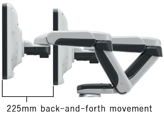 Legacy ultrasound machines can require operators to stretch and strain to keep the monitor in view. The Arietta 850 mounts the monitor on a flexible arm, supporting smooth movement of the screen back and forth, without changing its position laterally or vertically.